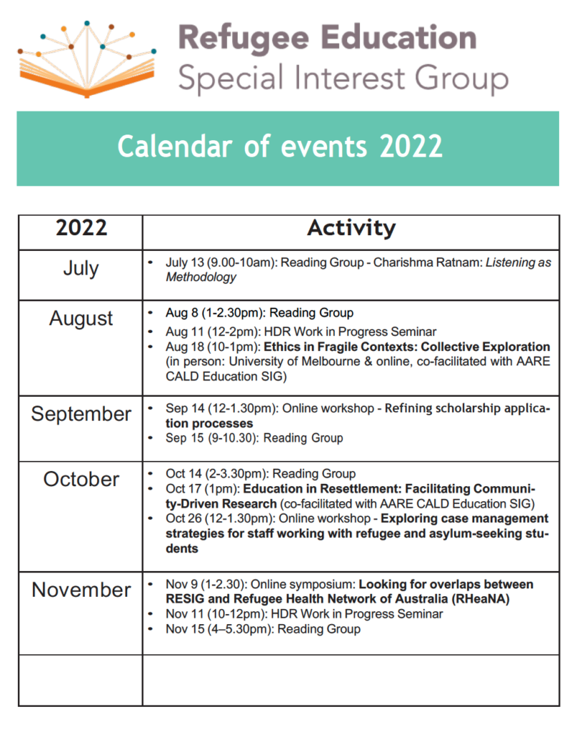 Refugee Week 2022 also coincided with RESIG’s sixth anniversary and some change in our Steering Committee structure. Five members of our team have moved on to new challenges, and we express our heartfelt gratitude to them for their generous contributions. Sally Morgan, Hanne Worsoe, Abiola Ajetomobi, John Tran, and Karen Dunwoodie: we thank you for everything you contributed to RESIG and wish you every success in your new adventures!